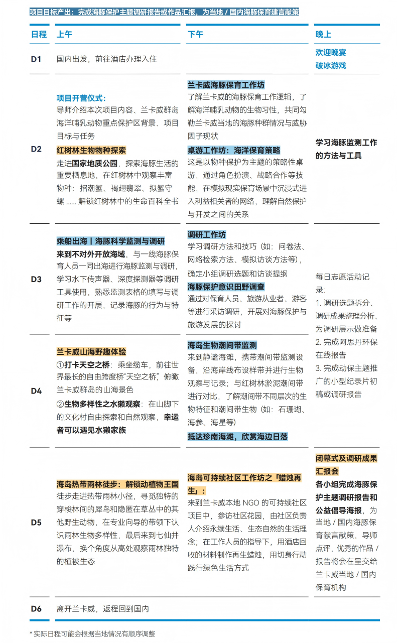出海进行海豚观测、红树林生物物种探索、海岛热带雨林徒步潮间带监测、本地农业手作体验、趣味桌游