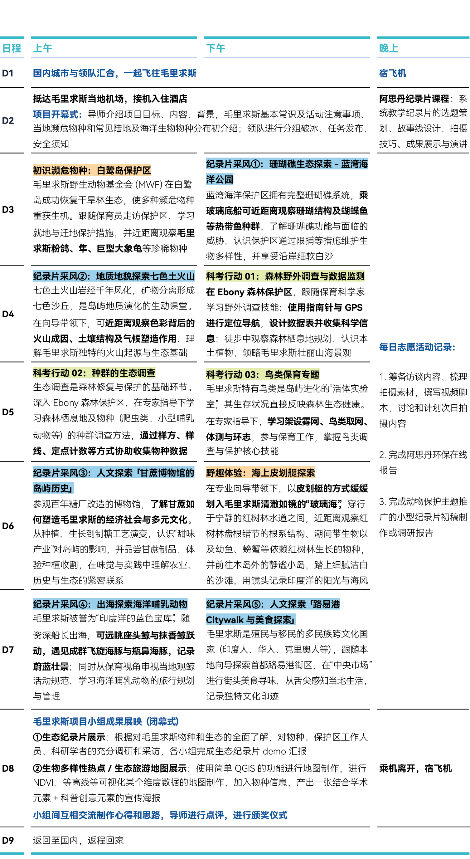 蓝湾海洋公园乘船探索珊瑚礁生态、出海遇见珍稀海洋哺乳动物(抹香鲸)、白鹭岛保护区记录濒危物种(毛里求斯粉鸽、隼、巨型大象龟等)、七色土火山探索地质地貌、海上皮划艇野趣体验、Ebony Forest 森林保护区科考行动(森林野外调查与数据监测、种群调查、鸟类保育)、甘蔗博物馆、路易港Citywalk 与美食探索