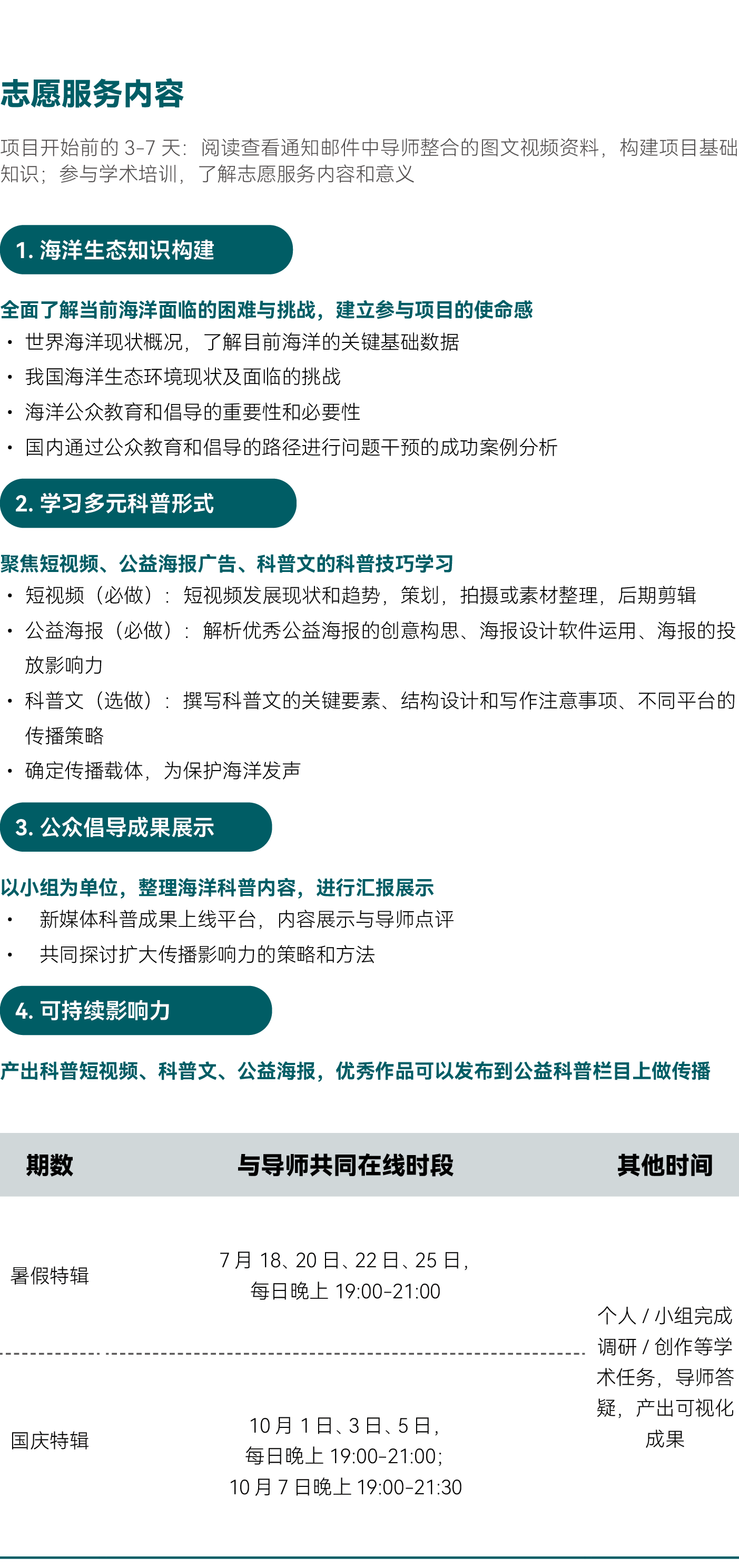 通过这次经历,我对海洋有了更深入的了解,并培养了新的兴趣爱好,我的价值观也因此得到了显著提升。在此过程中,我学会了如何撰写文章、剪辑视频和设计海报,这些技能不仅丰富了我的个人能力,也促进了我在人际交往和沟通方面的成长。