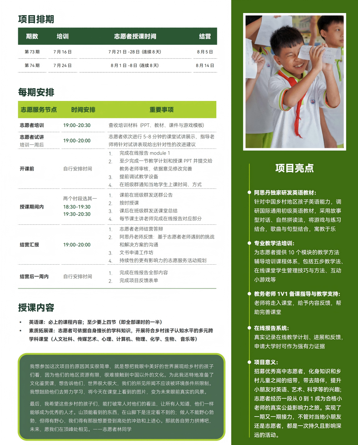招募优秀的高中生志愿者,为当地孩子进行丰富有趣的线上英语支教。从听、说、读、写全面提升当地孩子对英语学习的兴趣和信心,拓展他们的眼界,培养其线上学习的习惯。云端志愿服务的真实性