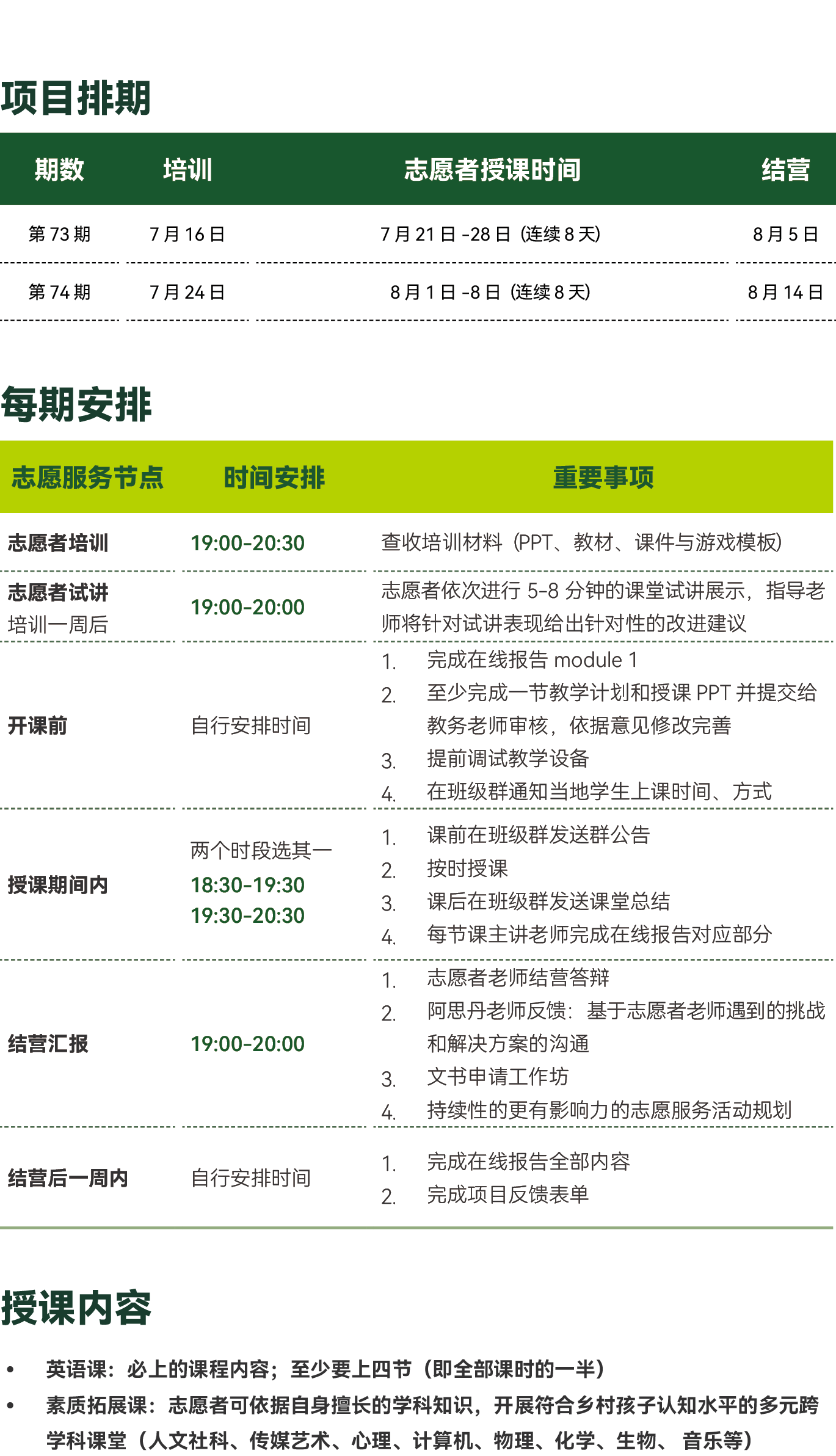 | 期数 | 培训 | 志愿者授课时间 | 结营 |
