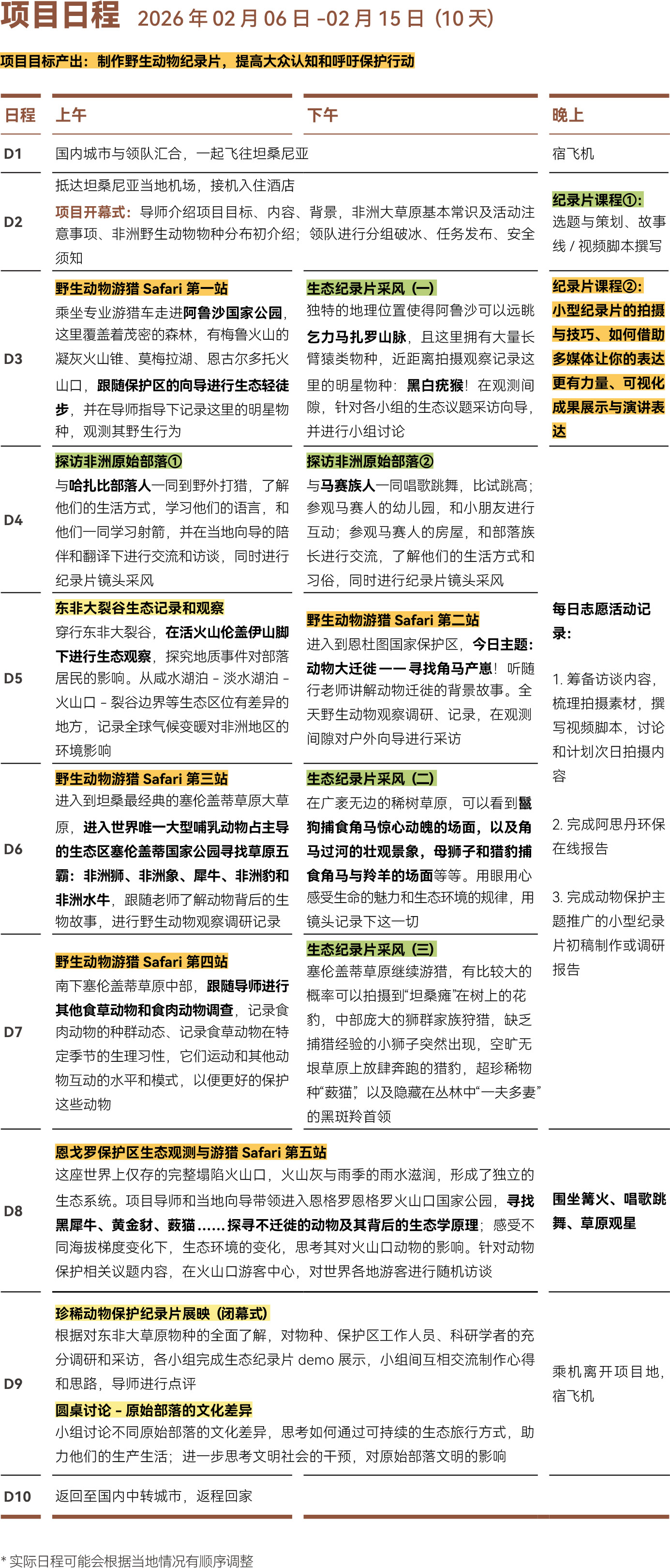 动物大迁徙Safari、围坐篝火唱歌、草原观星、火烈鸟监测东非大裂谷和恩戈罗火山口徒步、探访非洲原始部落探索