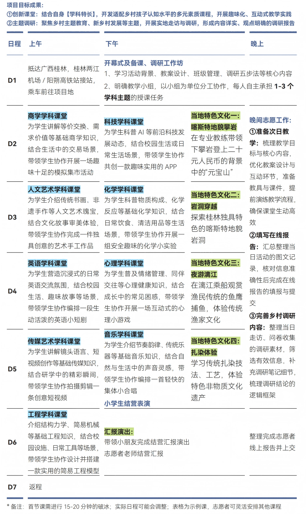 提升志愿者团队协作能力、创新能力、自我管理能力、问题解决能力等关键技能; 将素质教育课程带入乡村;乡村调研产出