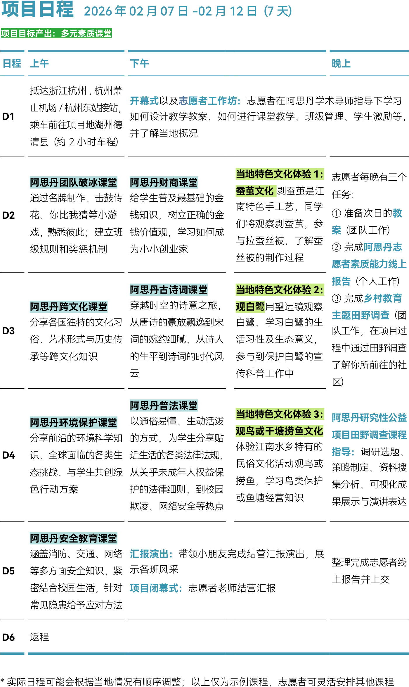 提升志愿者团队协作能力、创新能力、自我管理能力、问题解决能力等关键技能; 将素质教育课程带入乡村;乡村调研产出项目日程