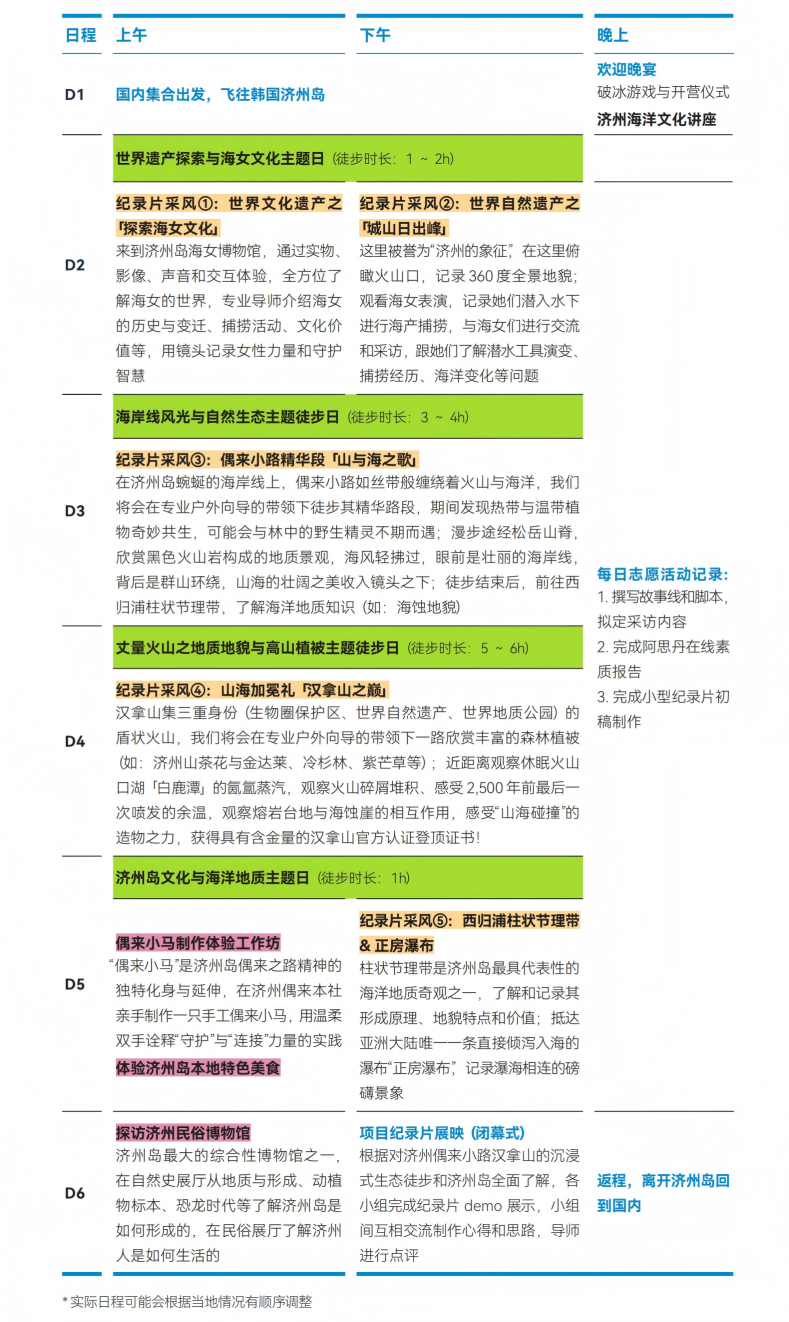 《济州海洋文化》专题讲座、济州岛海女博物馆、探访济州民俗博物馆、偶来小马玩偶制作体验、偶来小路精华路段徒步、登顶汉拿山之巅、品尝济州岛本地特色美食、海洋地质主题工作坊、参访西归浦柱状节理带。* 常青藤联盟申请系统中明确要求填写 " 领导力经历 " 和 " 挑战性活动 ",而户外徒步提供了看世界的新视角和户外领导力的天然场景,增加申请文书独特性