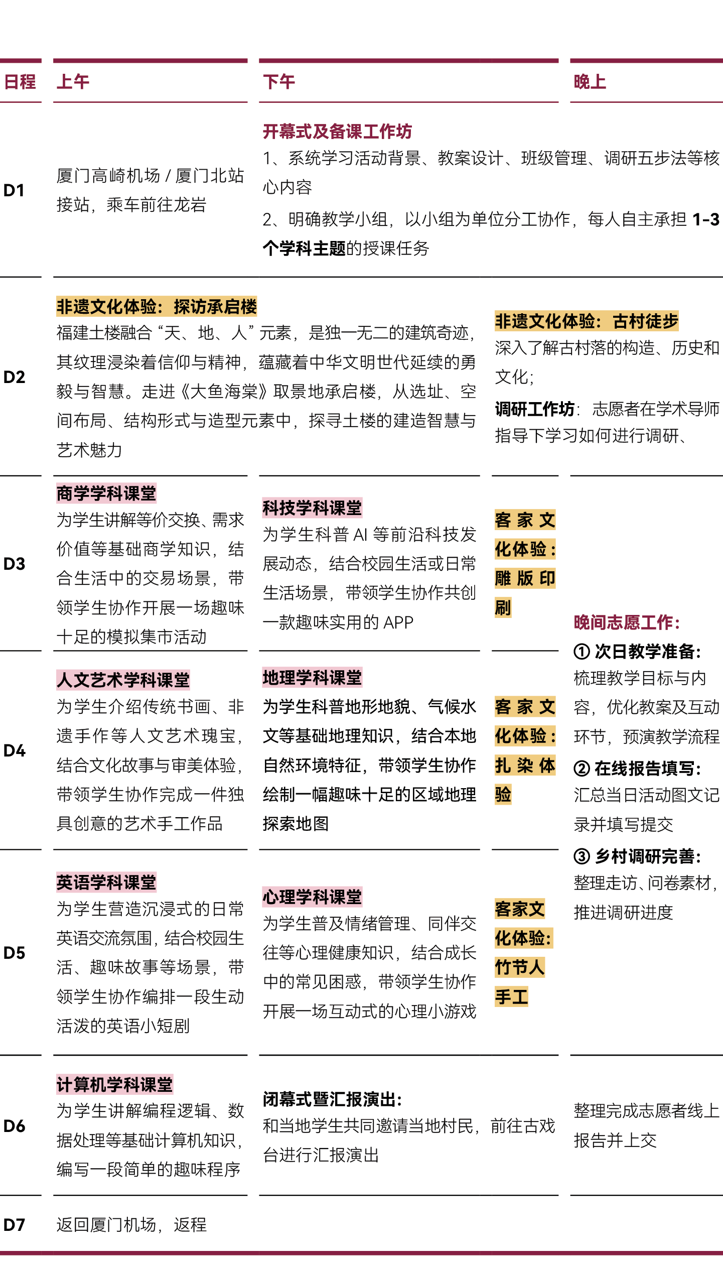 提升志愿者团队协作能力、创新能力、自我管理能力、问题解决能力等关键技能; 将素质教育课程带入乡村;乡村调研产出
