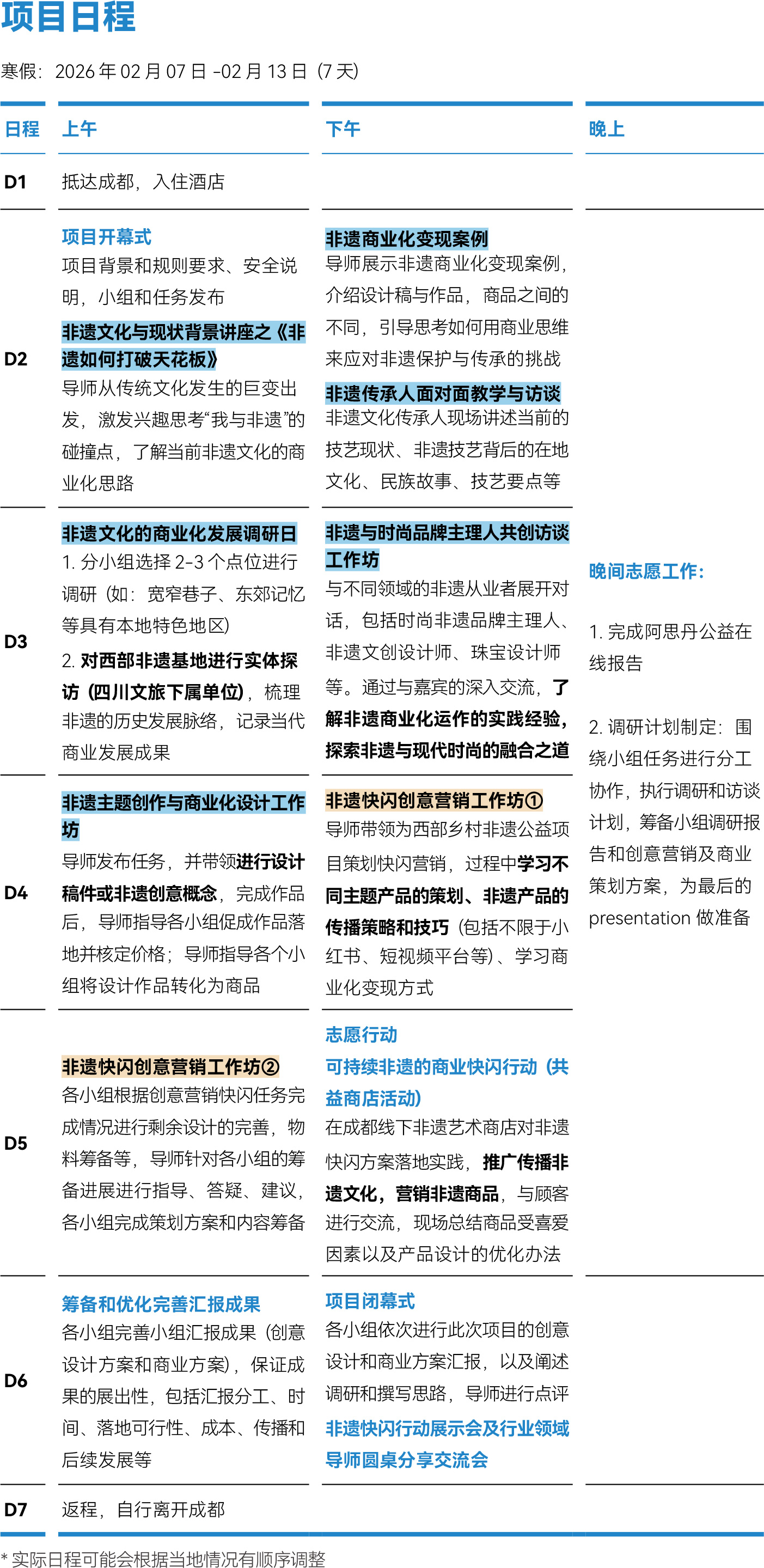 阿思丹调研、模拟访谈、表达力等主题工坊;非遗技艺传承与创新工作坊、非遗主题创作与商业化设计工作坊、非遗快闪创意营销工作坊、非遗文化与现状背景讲座课程